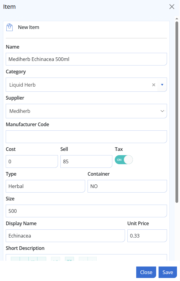 - The Display Name and Unit Price" are new fields which appear when you have selected the product type as Liquid Herbal AND selected NO on the Container field. Type in a useful short name for the herb, such as "Astragalus", or "St Mary's Thistle glycetract" (which will be displayed on the prescription) and the price is per mL, if you charge this way.