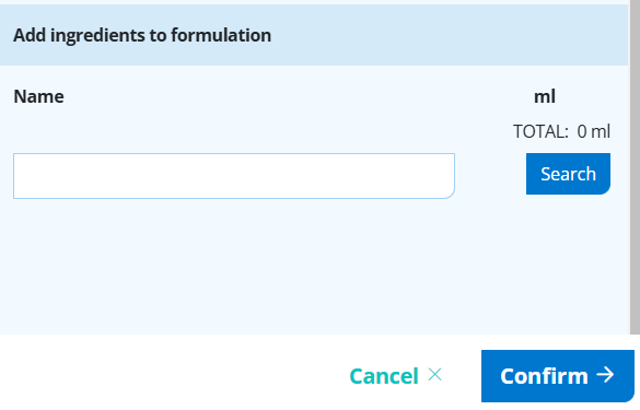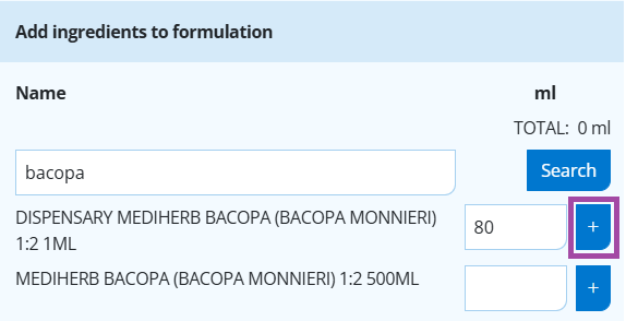 - type in each ingredient name -> select search -> type in the amount of mls for each ingredient next to it -> select add. Remember to select the right option, e.g. DISPENSARY items are for ordering from Ariya, other items can be selected if you are dispensing yourself or from another third party, hide any items you don't use to make selection easier.