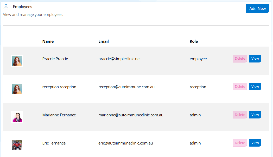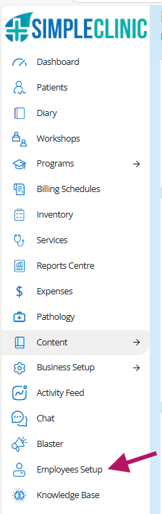 From the SimpleClinic left hand side main menu -> select the Employees option. The employees list will appear.