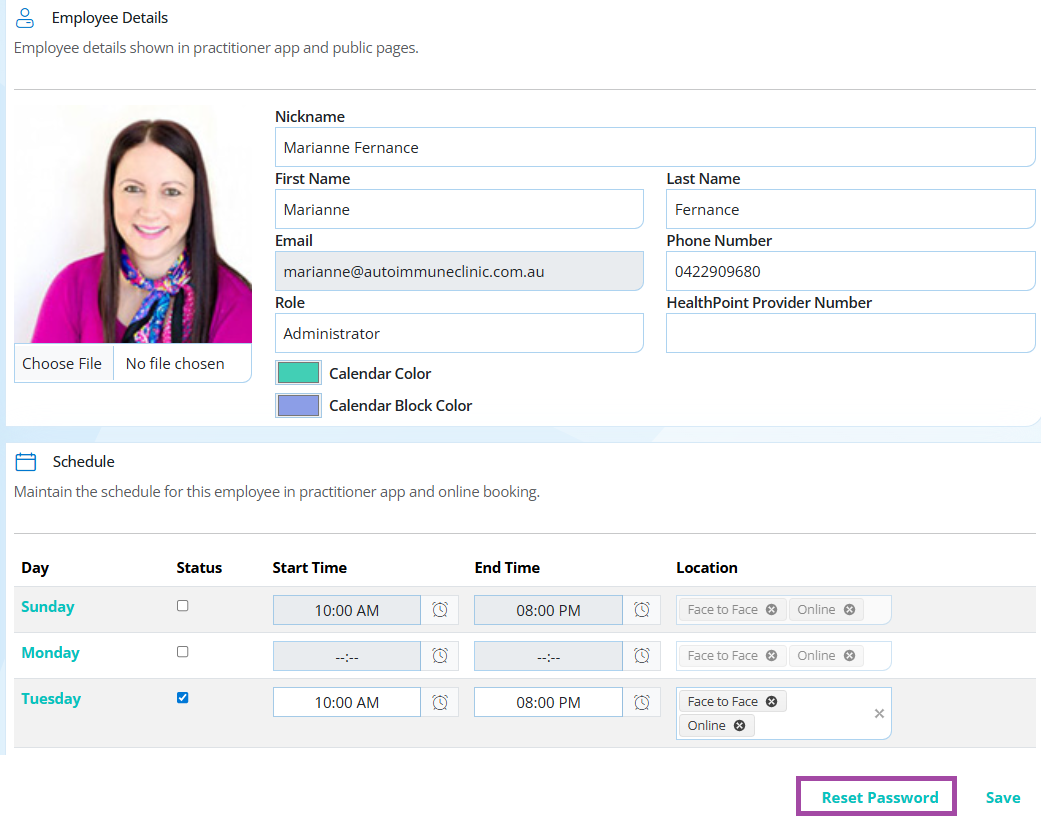 At the bottom right of the employee details screen is a "Reset Password" button.
