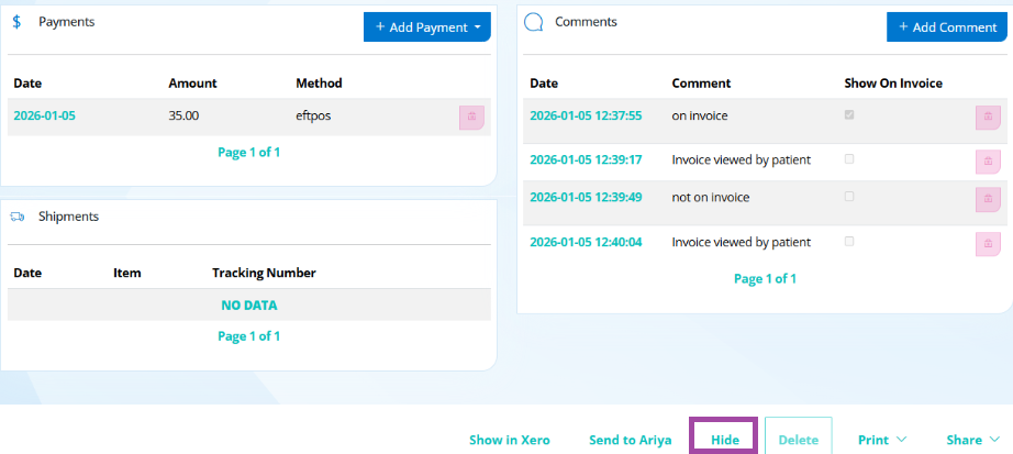 Hiding invoices is particularly useful if your clinic wants to hide an invoice but still have a record of the activity for auditing purposes.