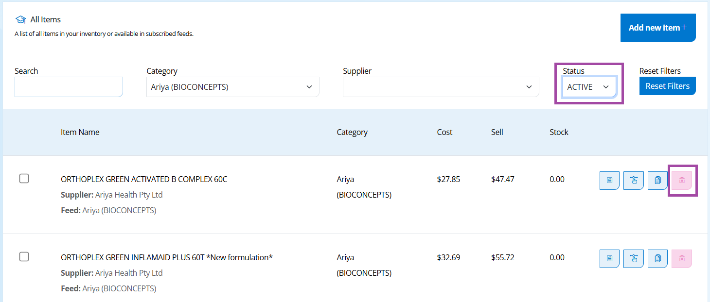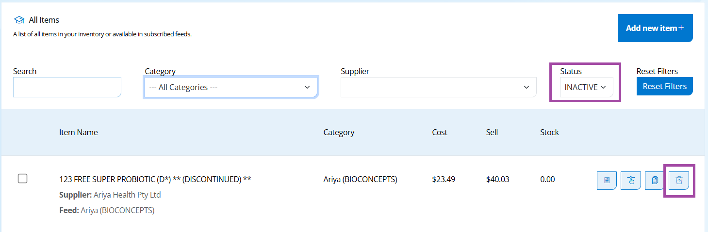 Items in the inventory feeds can be hidden so that they do not appear when adding items to an invoice or prescription.