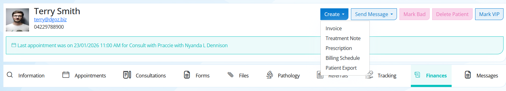 Step 11. You can view any past invoices in this section. For more details, see the Finances tab on the patient record.