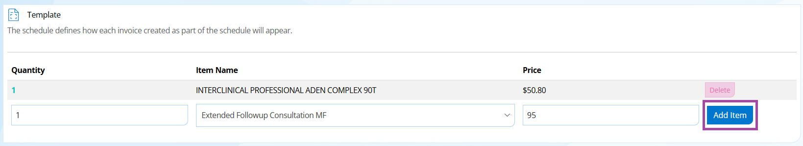 Step 2. Create the Billing Schedule by adding items to the template. Click 'Add Item' to add each item, items are not saved without this action.