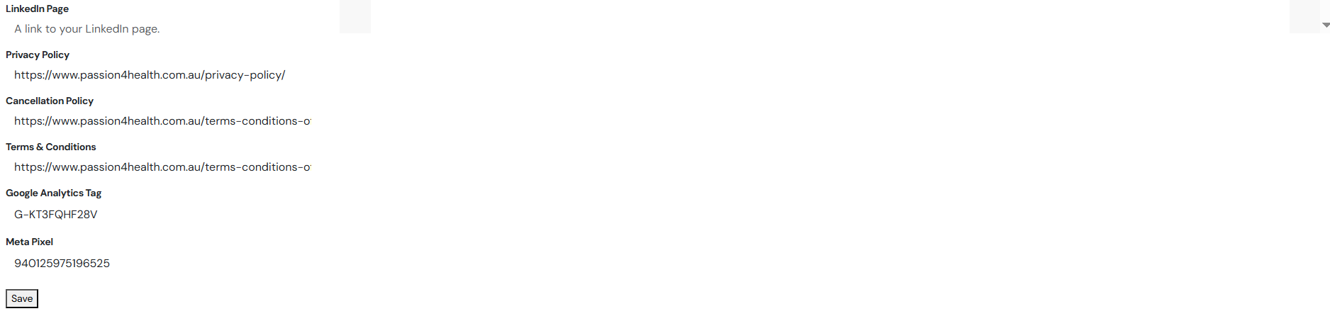 - Facebook Page = enter your Facebook page link here (e.g. https://www.facebook.com/passion4health)