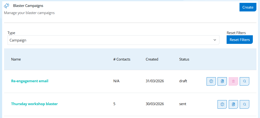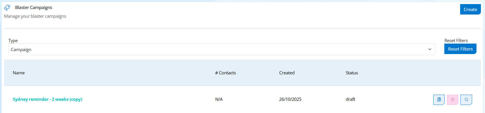 Step 15: To clone a blast -> select the document button (as below) -> this will open a copy of the same blast for you to edit and send.