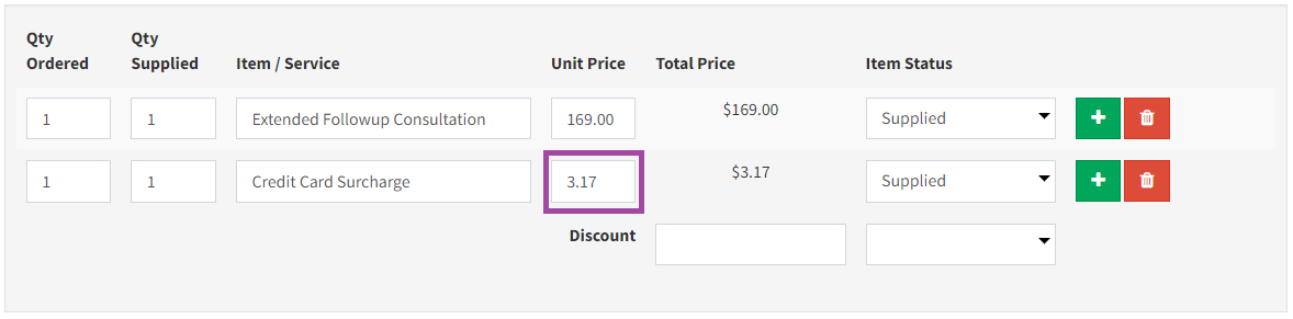 If you need to take credit card payments in person, then you need to add a line item for the surcharge to the invoice as below. This applies to in person payments using Stripe or Square on your phone, reader or terminal, or using saved credit card details on a patient record.