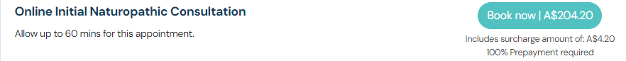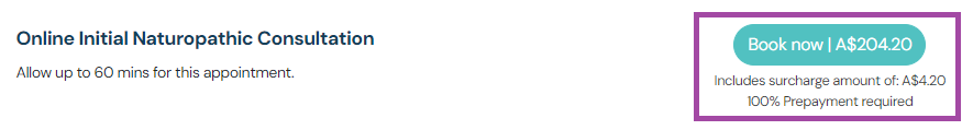 Online Booking: this shows an example of a $200 consultation prepayment fee with a 2.1% surcharge