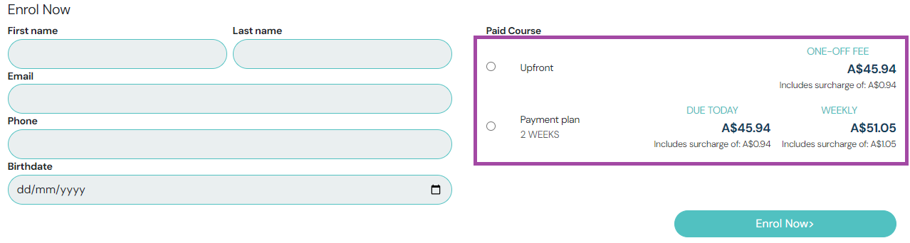 - Surcharges will only be automatically applied for online payments - invoices, workshops, programs and online bookings - see the steps below if you need to charge fees for in person payments.