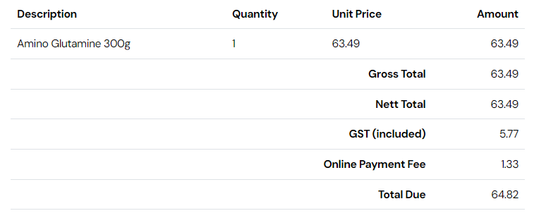 Invoice sent to patient: this shows an example of a $63.49 product with a 2.1% surcharge