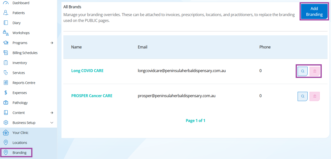 These can be attached to invoices, prescriptions, locations, and practitioners, to replace the branding used on the public pages.