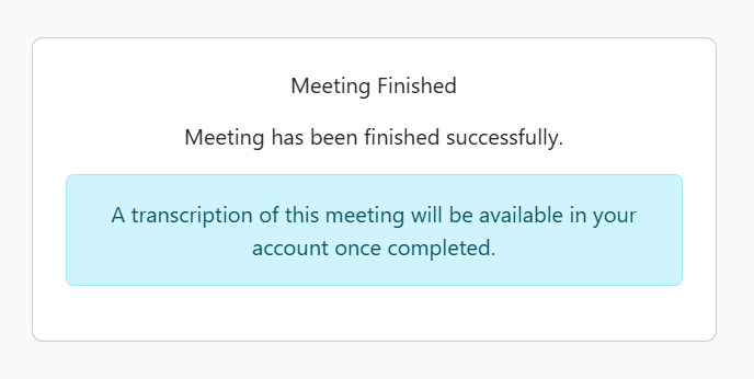 Step 5. Once you have ended your video call you will see a notification that a transcription of this meeting will be available in your account once completed. You can close the SC Meet tab and return to your SimpleClinic window.